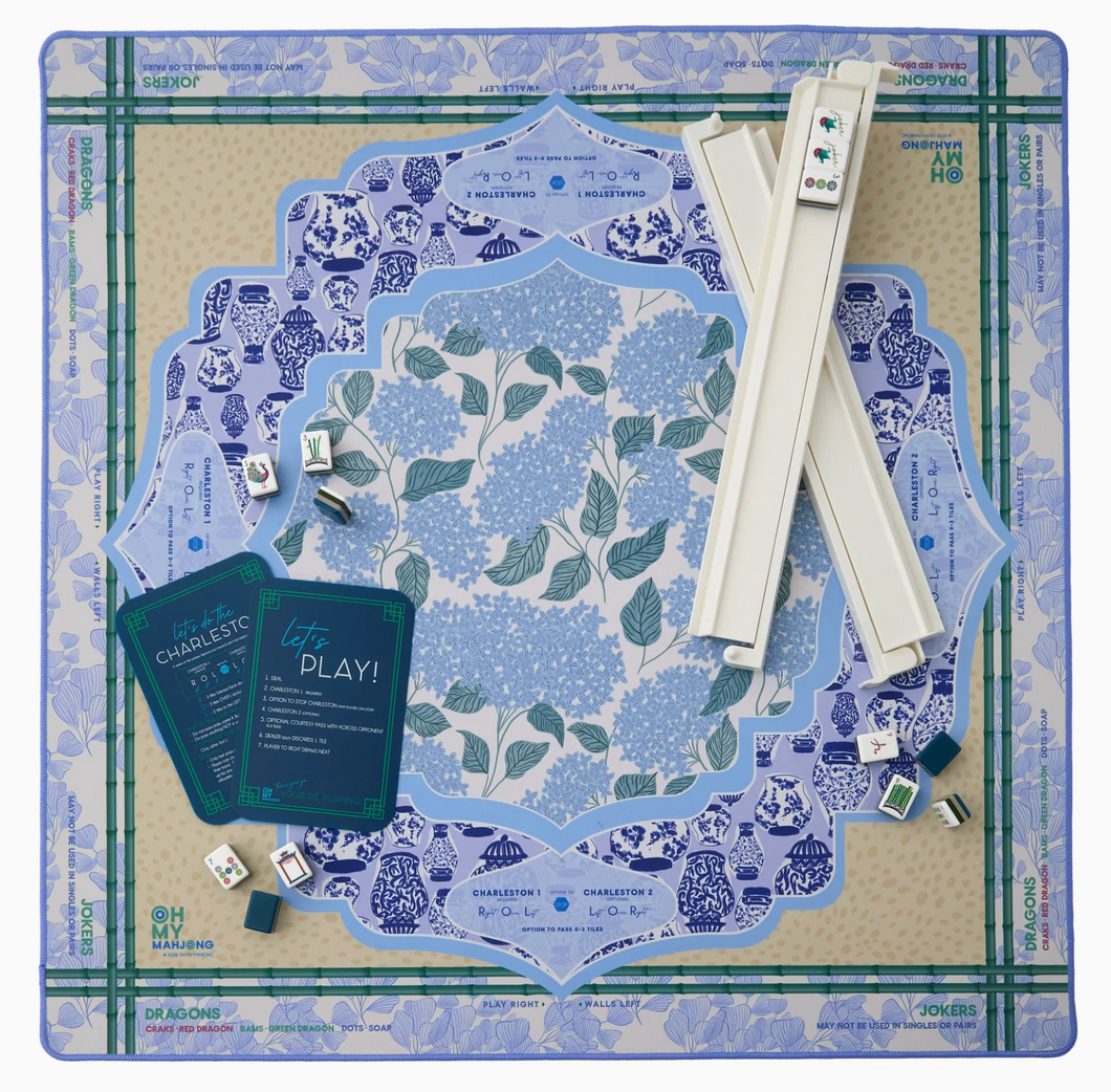 Introducing the Luna Mat — a serene yet statement-making addition to your Mahjong setup, designed for those who love timeless elegance with an artful twist. Awash in calming shades of blue and green, this mat beautifully blends hydrangea blooms, classic ginger jars, and a subtle antelope print for a look that’s equal parts coastal chic and heritage inspired. It’s sophisticated, layered, and quietly luxurious — the kind of pattern that feels right at home in your garden room, beach house, or candlelit game night setting.