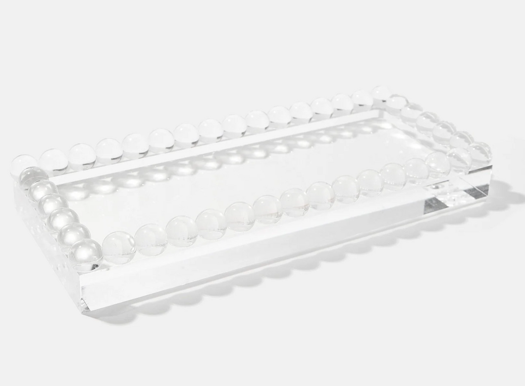 Add a touch of charm and function to your space with our Bubble Lucite Tray, designed to hold dinner napkins in style. The clear acrylic and playful bubble edging make it a perfect accent for bathrooms, powder rooms, or hosting setups. Beyond napkins, it’s just the right size to display a soap and lotion duo, your favorite perfumes, or other countertop essentials. Both practical and chic, this tray keeps everything organized while elevating any space.