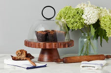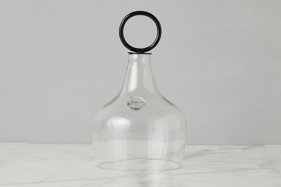The dramatic silhouette of a classic wine bottle demijohn inspired our Glass Cloche. The glass cloche is topped with a black iron ring handle. This decorative accent is handmade and pairs with serveware like cake stands, trays and trivets for a large array of styles and arrangements.
