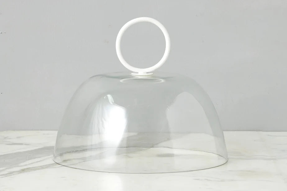 The dramatic silhouette of a classic wine bottle demijohn inspired our Glass Dome. The glass dome is topped with a white iron ring handle. This decorative accent is handmade and pairs with serveware like cake stands, trays and trivets for a large array of styles and arrangements.