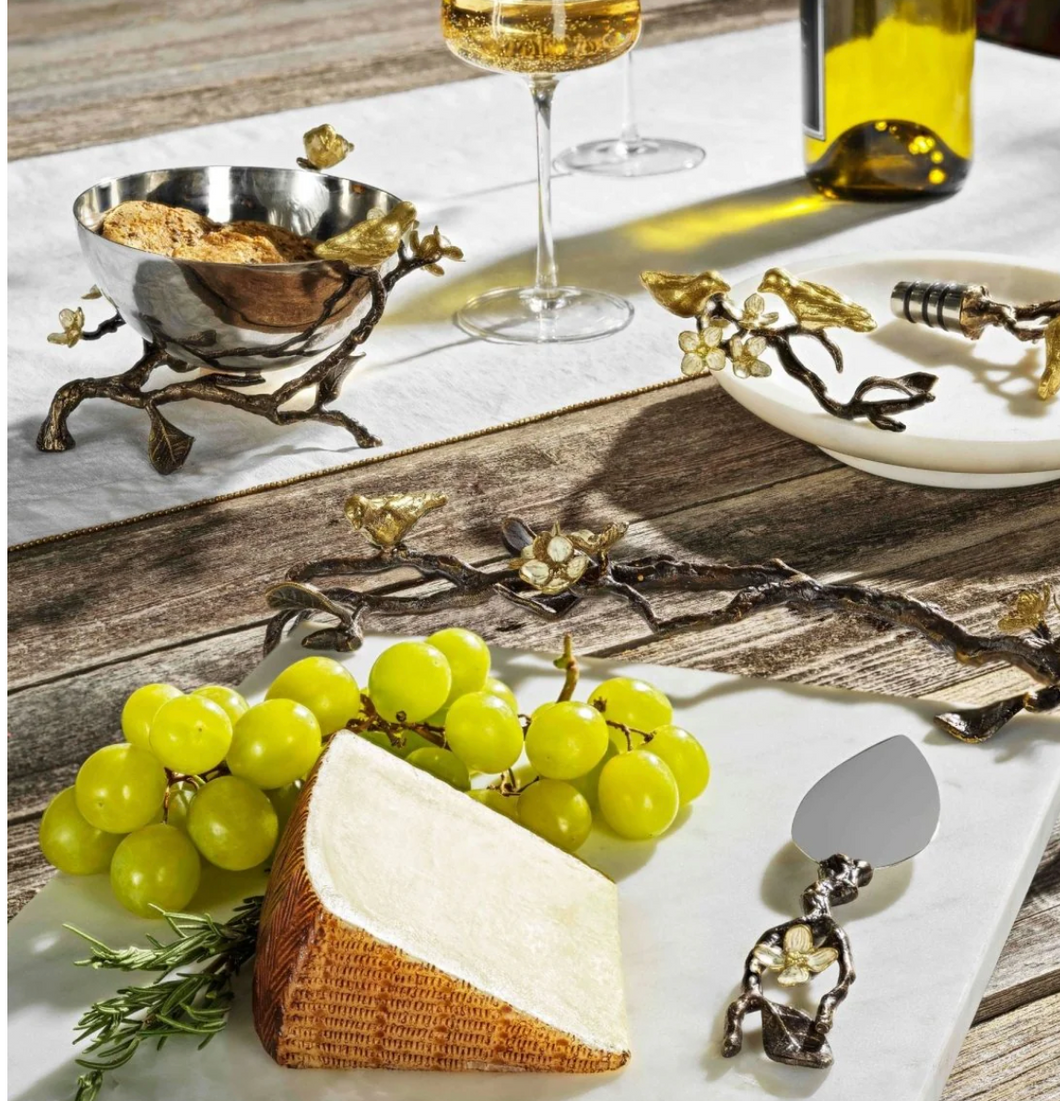The Lovebirds Collection celebrates love and the deeply engrained nature in us all to bond with one another. The branch that the birds perch upon symbolizes growth and evokes tree of life imagery. The white, four-petaled flowers represent wholeness, unity, and innocence.