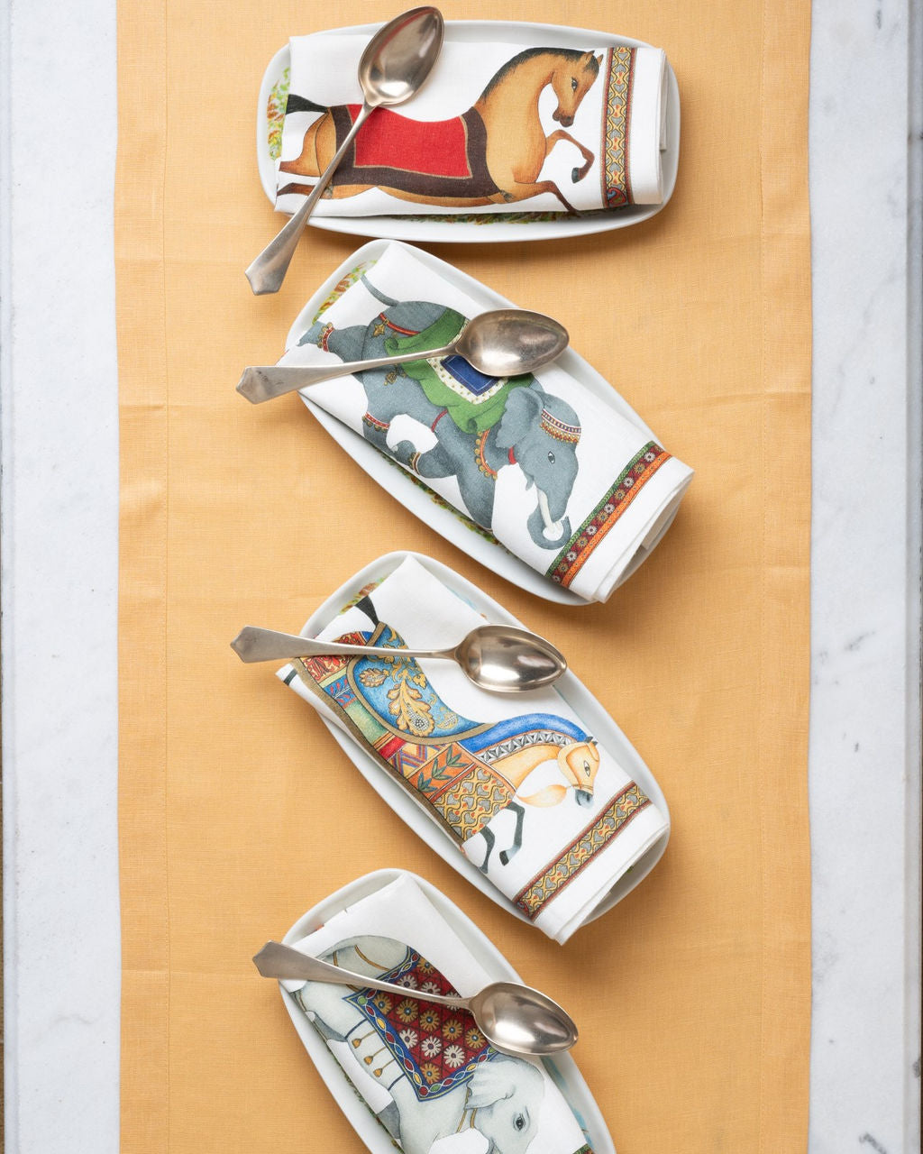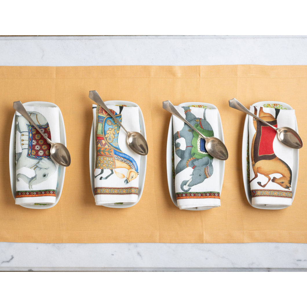 Tessitura Toscana Telerie Maharajah Dinner Napkins are bright and captivating. Each four-piece set features 4 different subjects designed with the usual refinement, taste and artistic flair of Tessitura Toscana Telerie. In this set you will find a variety of animals to be thought to be royalty. In Sanskrit it stands for a "great ruler", "great king" or "high king". These napkins are for those who love beauty in everyday life. Simple hem with mitered corners. 100% linen. Made in Italy.