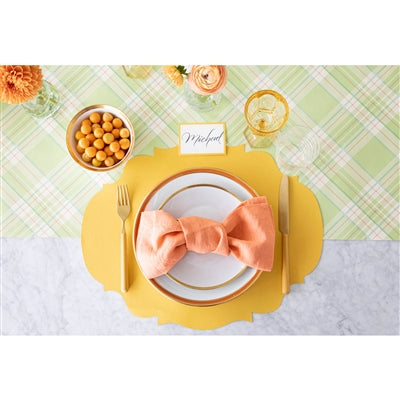 Set the scene for your table with our classic Die-cut Marigold French Frame Placemat. Made from a warm, yellow paper stock, this elegant frame creates a beautiful paper charger for your dinnerware. This placemat acts as a grounding piece for your table settings, and can be used on its own, or in combination with other everyday or seasonal favorites to create a welcoming tablescape.