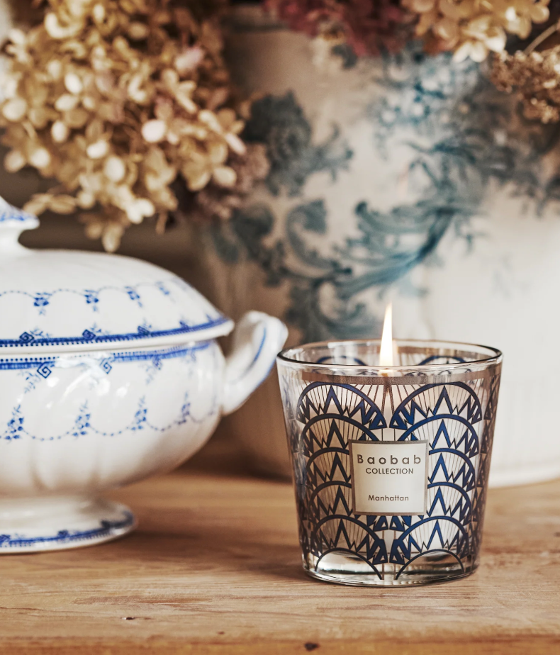The Manhattan scented candle is poured in a glass that bears a platinum and navy blue screen-printed design inspired by the art deco architecture of the Chrysler building.