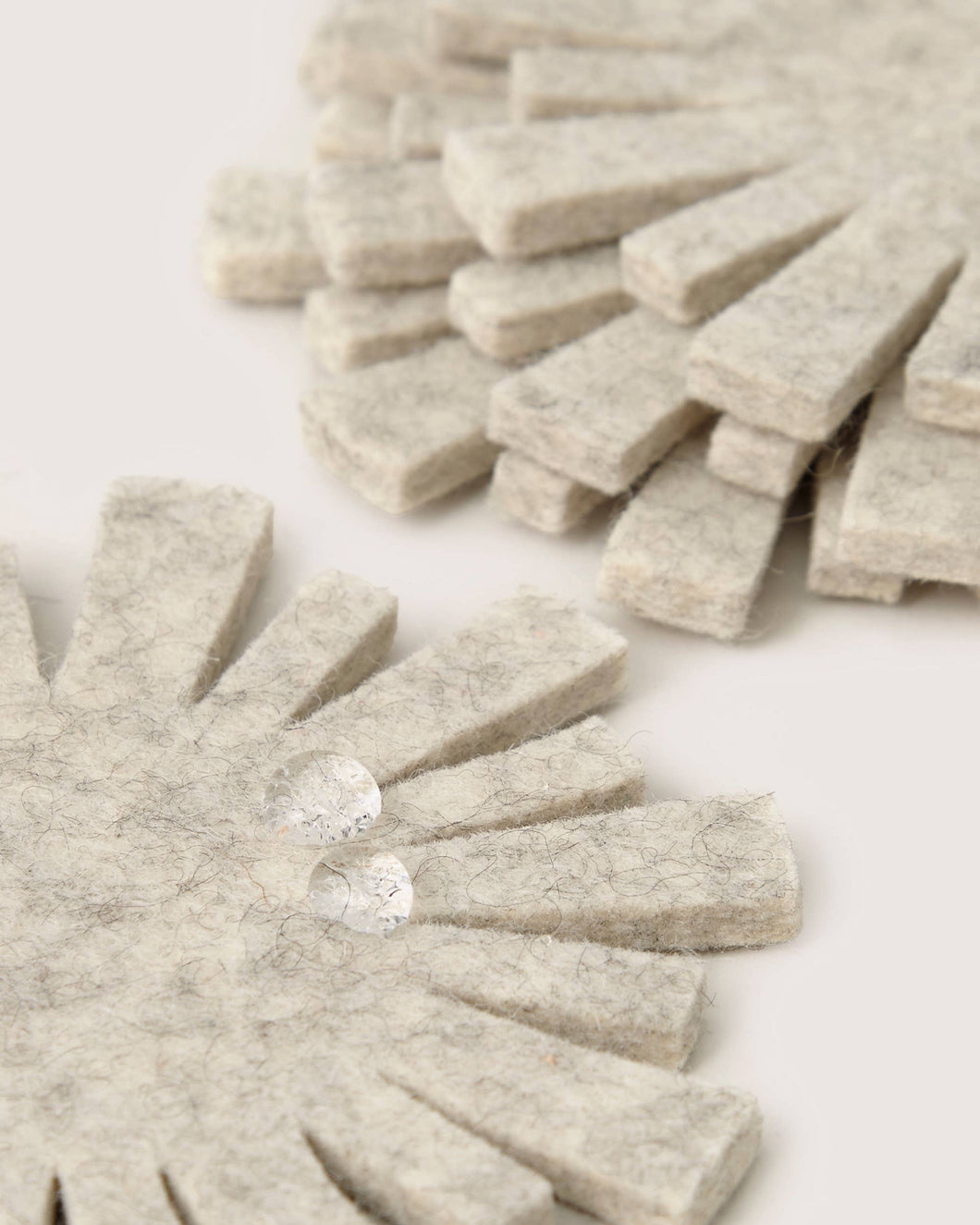 Elevate your table settings with the Merino Wool Starburst Coasters in a soft Heather White hue. This elegant 4-pack combines sophistication with functionality, making it easy to protect surfaces while adding a hint of warmth to any space. The Heather White color lends a touch of understated luxury, creating a beautiful backdrop for seasonal gatherings or everyday enjoyment. Benefits of Merino Wool  Sustainable, biodegradable, and renewable Odor, stain, heat, and dirt-resistant Oeko-Tex® Certified