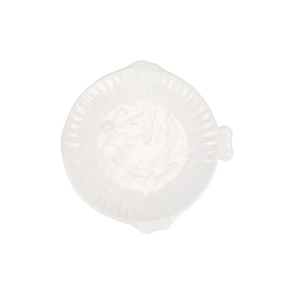 Playing off the handpressed edges of Pietra Serena, Pesce Serena features unique fish silhouettes in a glossy white glaze that reflects light like sunshine glimmering on the ocean waves. This Pesce Serena Aqua Salad Plate is a perfect table base for any ocean or beach lover.
