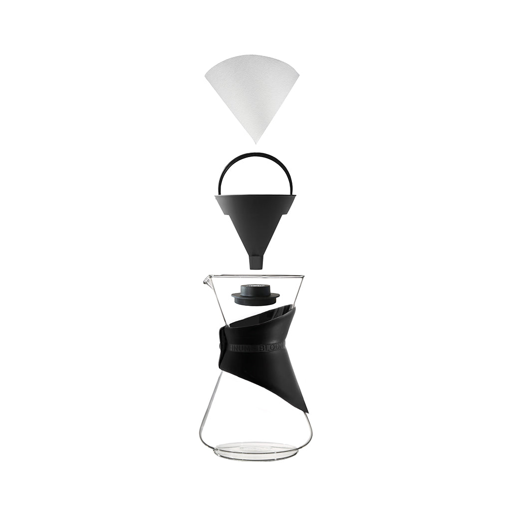 The stylish pour-over coffee brewer BLOOM AND FLOW, winner of the GOOD DESIGN Award, can be operated with any standard paper cone filter (No.2 and No.4) or any V-shape filter, allowing you to brew either 2,4 or 6 cups. Brewer consists of the heat-resistant glass carafe and a unique funnel insert, providing an optimized blooming and flow of your coffee through the filter paper.