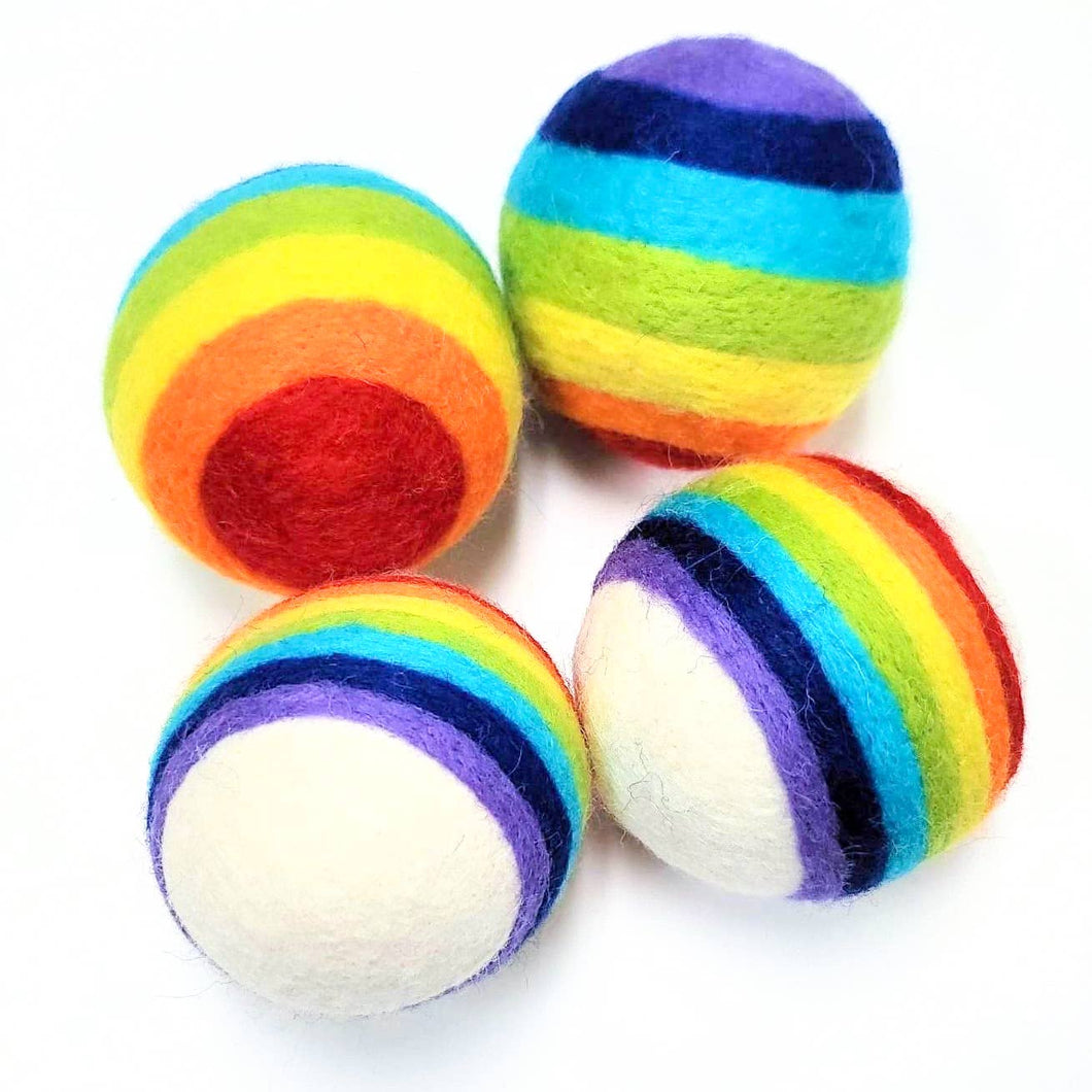 A set of 4, handmade needle felted rainbow balls, in a reusable black and white hand printed, hand made cotton storage bag. Perfect for small and medium loads, can be doubled for large loads. No physical user manual included, no paper waste!