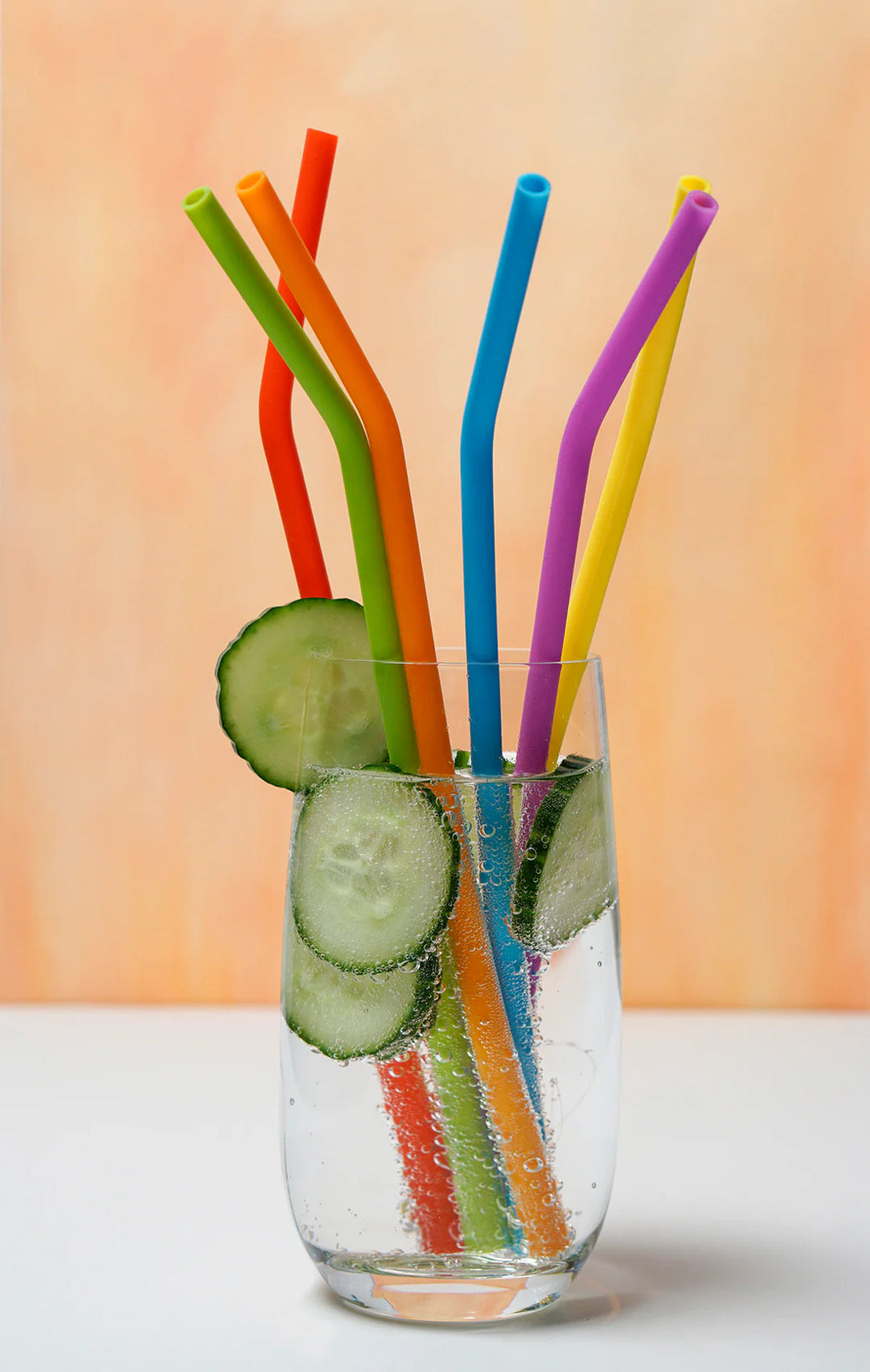 • A set of six bent silicone straws with a cleaning brush. Use for smoothies, bubble tea, ice cream floats and other frozen drinks.
